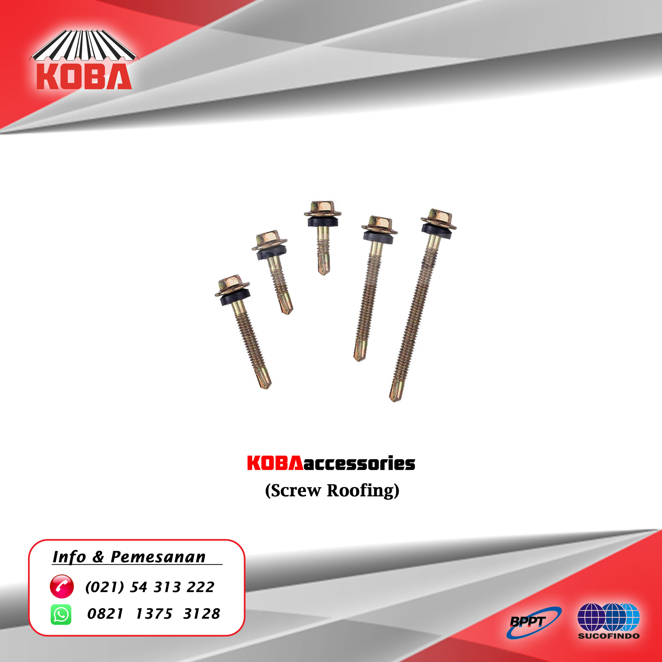 Screw Roofing adalah baut yang berupa Sekrup yang berfungsi untuk menyambungkan atap sehingga merekat dengan kuat. Screw Roofing atau Baut roofing dilengkapi dengan karet agar air hujan tidak masuk ke sela sela baut ukurannyapun bervariasi.
